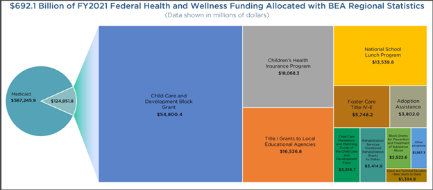 In FY2021 $692.1 billion dollars of federal funds were allocated with BEA regional statistics of personal income (chart below, click to enlarge). The biggest portion of federal funds allocated with BEA personal income statistics is via the Medicaid program ($567.2 billion). The amount of federal matching funds for state expenditures on the Medicaid program are determined by the Federal Medical Assistance Percentages (FMAP) formula calculated by the Department of Health and Human Services using state per capita personal income from the BEA each year.  For more information on the FMAP formula and Medicaid visit the Department of Health and Human Services.